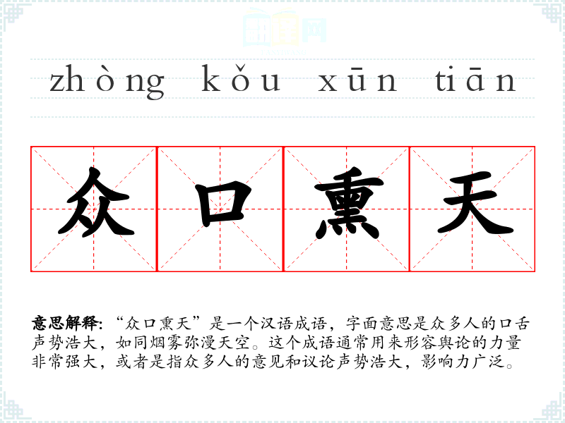 “众口熏天”是一个汉语成语,字面意思是众多人的口舌声势浩大,如同烟雾弥漫天空。这个成语通常用来形容舆论的力量非常强大,或者是指众多人的意见和议论声势浩大,影响力广泛。