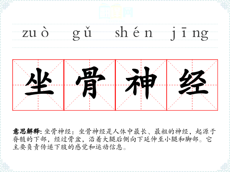词源:坐骨神经(sciatic nerve)一词源自拉丁语“nervus ischiadicus”,其中“sciatic”来自希腊语“ischiadikos”,意为“与坐骨相关的”。
