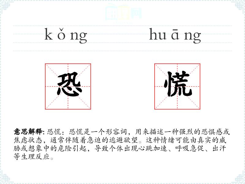 - 同义词:恐惧、惊慌、焦虑、慌乱