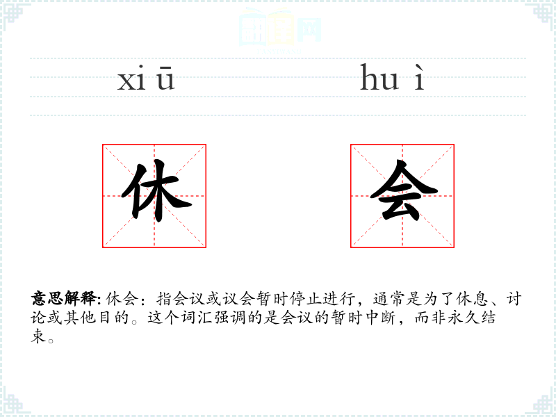 - 文学:在文学作品中,“休会”可能被用来描述一个紧张或重要的会议场景中的短暂停顿,为故事情节提供喘息的空间。