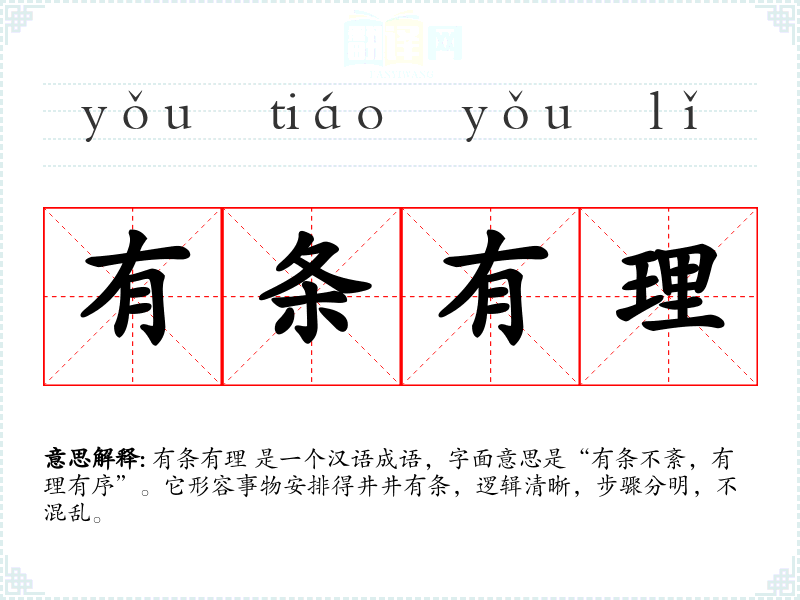 有条有理 是一个汉语成语,字面意思是“有条不紊,有理有序”。它形容事物安排得井井有条,逻辑清晰,步骤分明,不混乱。