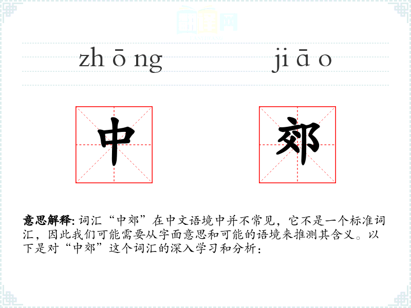 词汇“中郊”在中文语境中并不常见,它不是一个标准词汇,因此我们可能需要从字面意思和可能的语境来推测其含义。以下是对“中郊”这个词汇的深入学习和分析: