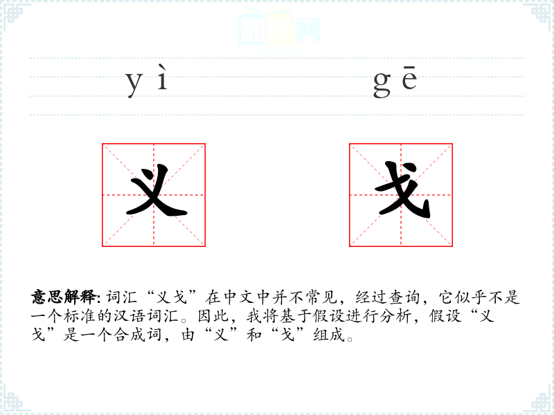 词汇“义戈”在中文中并不常见,经过查询,它似乎不是一个标准的汉语词汇。因此,我将基于假设进行分析,假设“义戈”是一个合成词,由“义”和“戈”组成。