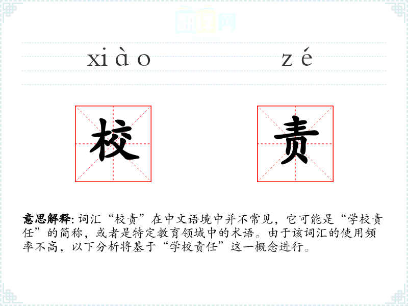 词汇“校责”在中文语境中并不常见,它可能是“学校责任”的简称,或者是特定教育领域中的术语。由于该词汇的使用频率不高,以下分析将基于“学校责任”这一概念进行。