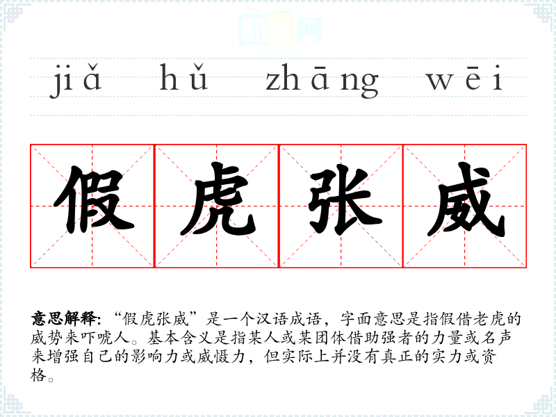 “假虎张威”是一个汉语成语,字面意思是指假借**的威势来吓唬人。基本含义是指某人或某团体借助强者的力量或名声来增强自己的影响力或威慑力,但实际上并没有真正的实力或资格。