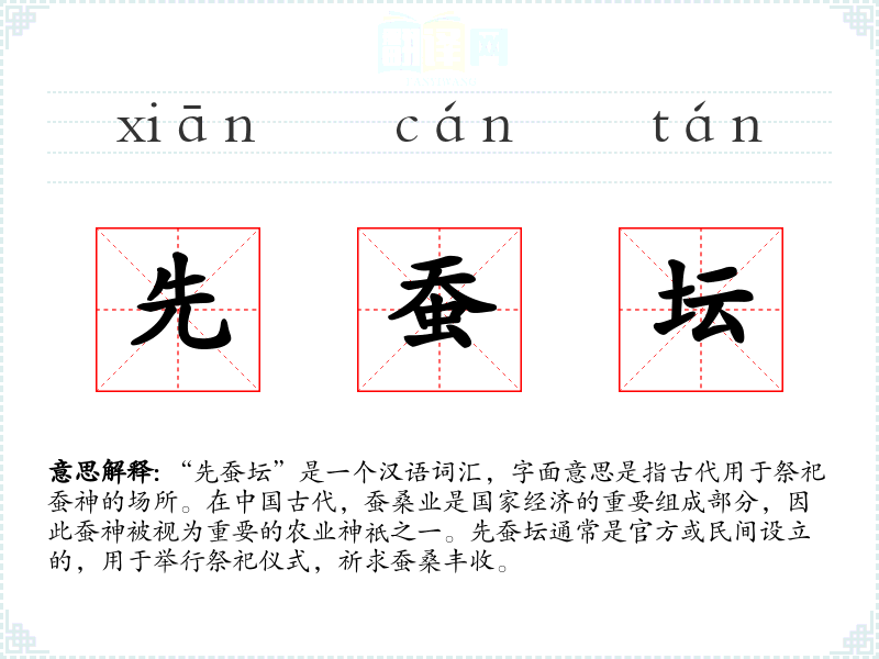 “先蚕坛”作为一个历史词汇,不仅承载了古代农业文化的信息,也反映了古代社会对自然和神灵的敬畏。在语言学*和表达中,了解这样的词汇有助于更深入地理解**传统文化和历史。
