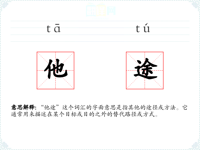 “他途”由“他”和“途”两个字组成。在古代汉语中,“他”指代“其他的”,“途”指代“路径”或“方法”。随着时间的推移,这个词汇的含义基本保持不变,但在现代汉语中使用频率可能有所下降。