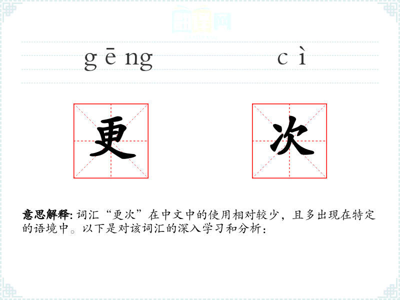 词汇“更次”在中文中的使用相对较少,且多出现在特定的语境中。以下是对该词汇的深入学*和分析: