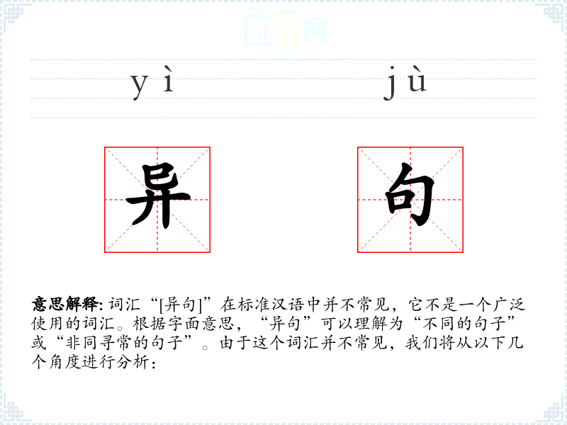 词汇“[异句]”在标准汉语中并不常见,它不是一个广泛使用的词汇。根据字面意思,“异句”可以理解为“不同的句子”或“非同寻常的句子”。由于这个词汇并不常见,我们将从以下几个角度进行分析: