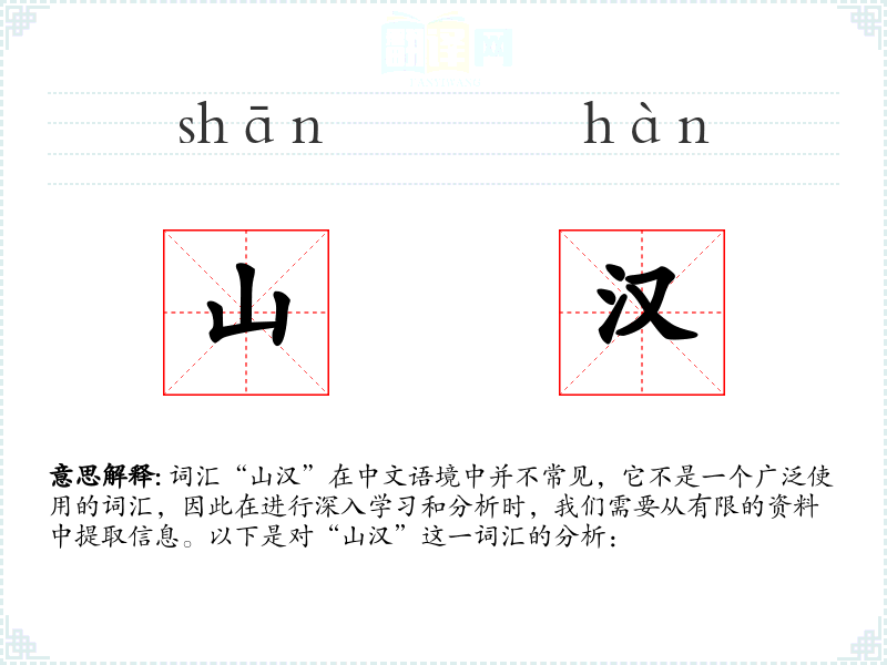 “山汉”字面意思是指居住在山区的人,特别是指那些长期生活在偏远山区、生活方式较为原始或传统的人。这个词汇可能带有一定的地域性和文化特色。