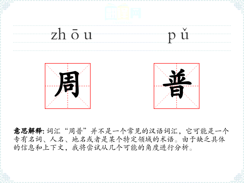 词汇“周普”并不是一个常见的汉语词汇,它可能是一个专有名词、人名、地名或者是某个特定领域的术语。由于缺乏具体的信息和上下文,我将尝试从几个可能的角度进行分析。