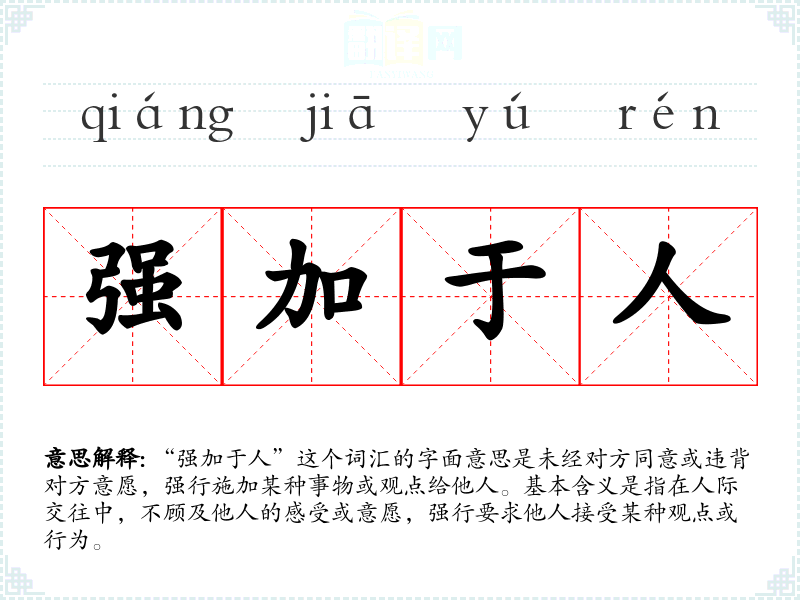 “强加于人”这个词汇提醒我们在人际交往中要尊重他人的意愿和选择。在语言学*和表达中,理解和正确使用这个词汇有助于我们更好地沟通和处理人际关系。