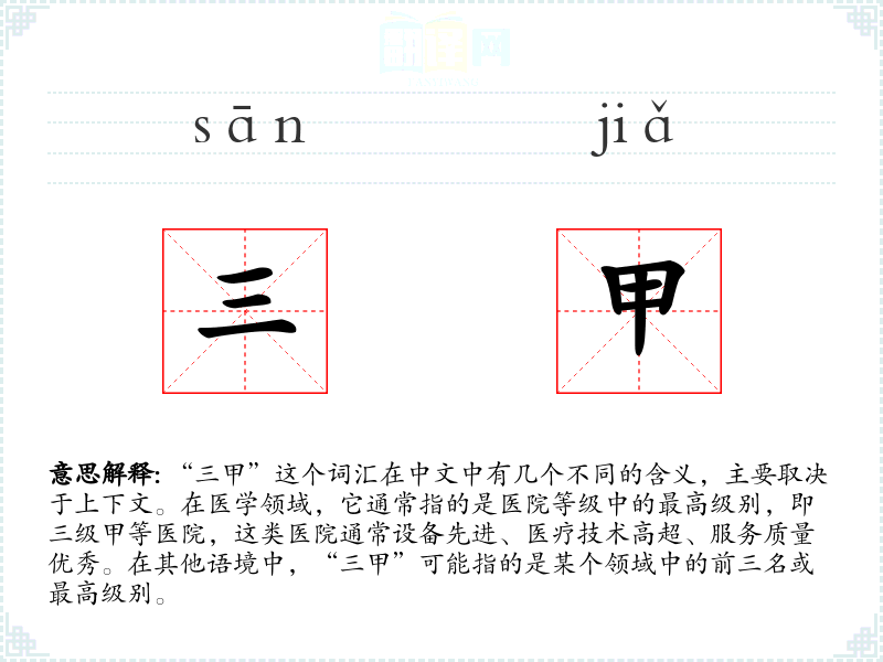 - 口语:在日常口语中,“三甲”可能被用来形容某个领域或活动中的顶尖水平。
