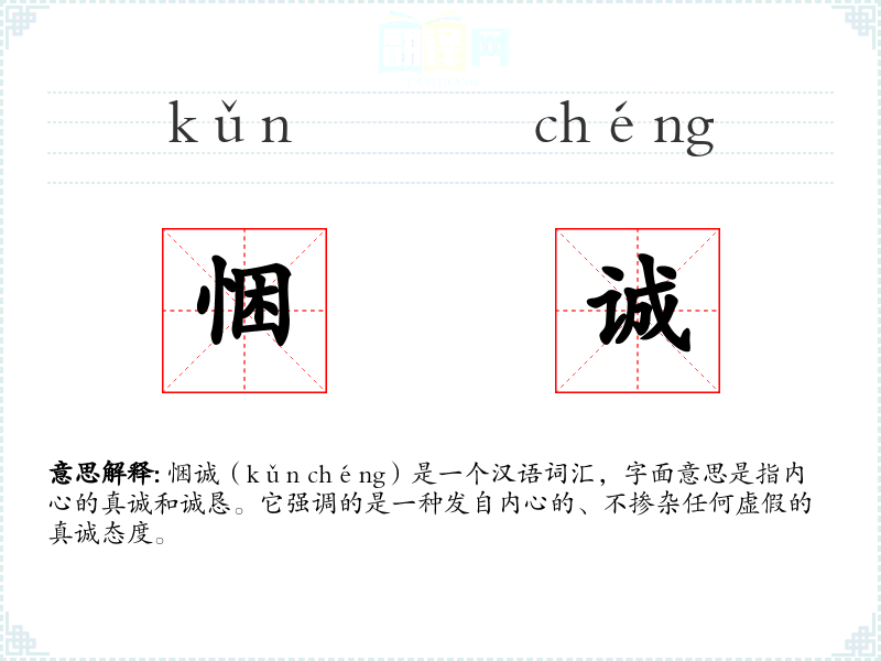 悃诚(kǔn chéng)是一个汉语词汇,字面意思是指内心的真诚和诚恳。它强调的是一种发自内心的、不掺杂任何虚假的真诚态度。