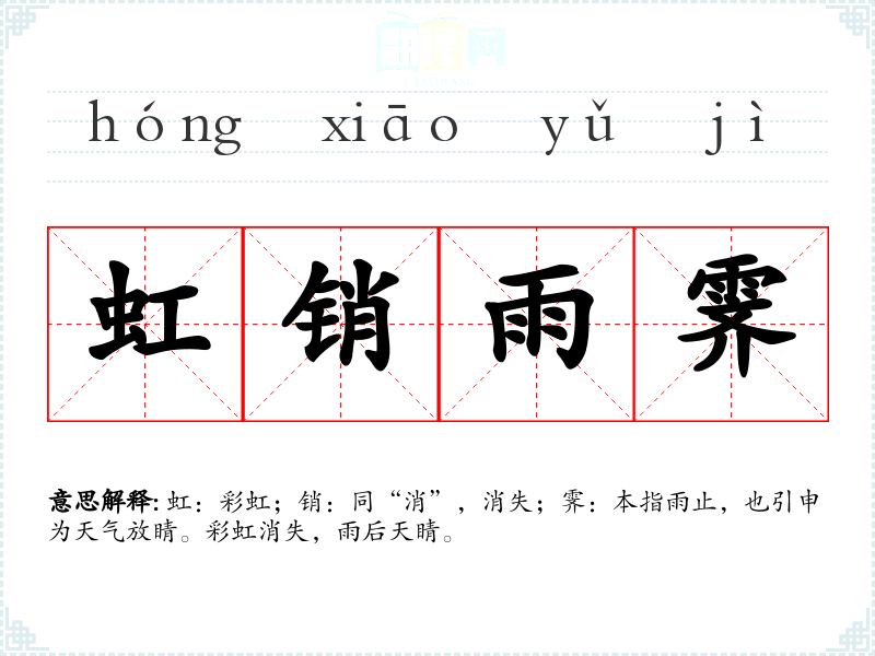 虹:彩虹;销:同“消”,消失;霁:本指雨止,也引申为天气放睛。彩虹消失,雨后天睛。