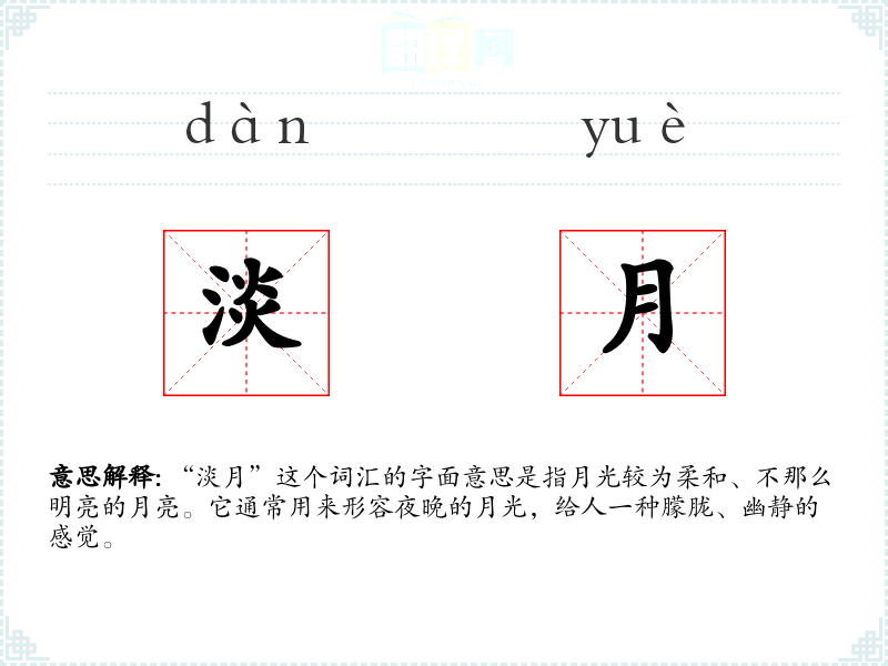 “淡月”这个词汇的字面意思是指月光较为柔和、不那么明亮的月亮。它通常用来形容夜晚的月光,给人一种朦胧、幽静的感觉。