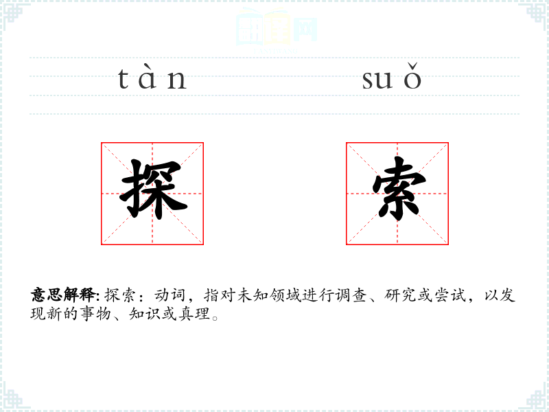 探索:动词,指对未知领域进行调查、研究或尝试,以发现新的事物、知识或真理。