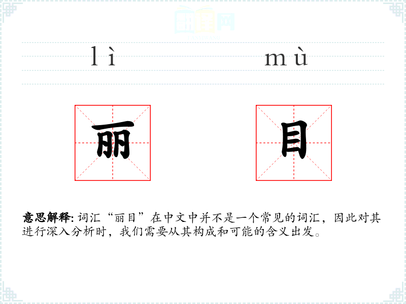 词汇“丽目”在中文中并不是一个常见的词汇,因此对其进行深入分析时,我们需要从其构成和可能的含义出发。