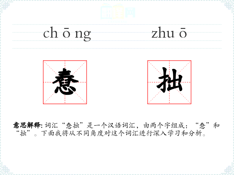 词汇“憃拙”是一个汉语词汇,由两个字组成:“憃”和“拙”。下面我将从不同角度对这个词汇进行深入学*和分析。