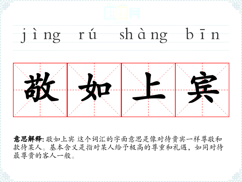 敬如上宾 这个词汇的字面意思是像对待贵宾一样尊敬和款待某人。基本含义是指对某人给予极高的尊重和礼遇,如同对待最尊贵的客人一般。