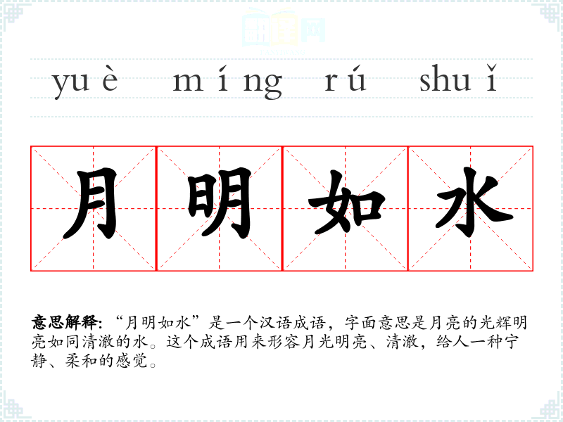 “月明如水”这个成语不仅形容了月光的美丽,也承载了丰富的文化内涵和情感联想。在语言学*和表达中,理解和运用这样的成语可以增强语言的表达力和文化深度。
