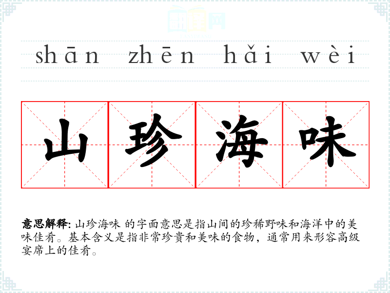 山珍海味 的字面意思是指山间的珍稀野味和海洋中的美味佳肴。基本含义是指非常珍贵和美味的食物,通常用来形容高级宴席上的佳肴。