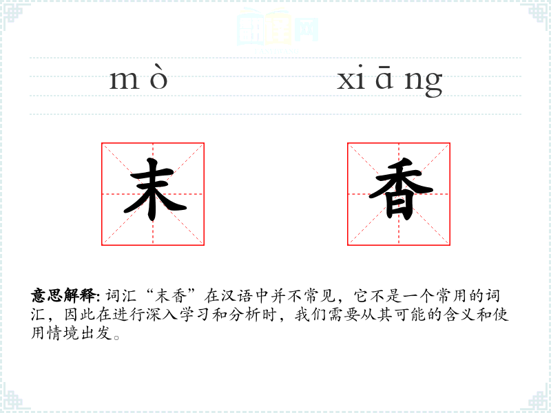 词汇“末香”在汉语中并不常见,它不是一个常用的词汇,因此在进行深入学*和分析时,我们需要从其可能的含义和使用情境出发。