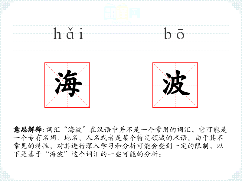 由于“海波”不是一个常见的词汇,对其的理解可能较为有限。在语言学和表达中,了解和掌握常用词汇更为重要。如果“海波”是一个特定领域的术语或专有名词,那么在其专业领域内进行深入学将更为有益。