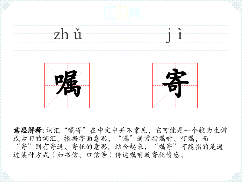 - 反义词:无(由于“嘱寄”较为生僻,反义词不明显)