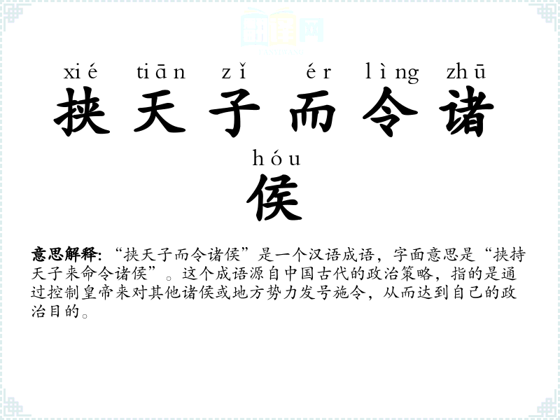 “挟天子而令诸侯”是一个汉语成语,字面意思是“挟持天子来命令诸侯”。这个成语源自古代的政治策略,指的是通过控制来对其他诸侯或地方势力发号施令,从而达到自己的政治目的。