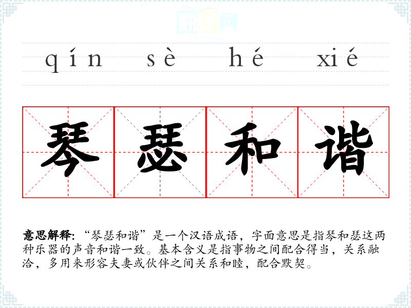“琴瑟和谐”是一个汉语成语,字面意思是指琴和瑟这两种乐器的声音和谐一致。基本含义是指事物之间配合得当,关系融洽,多用来形容夫妻或伙伴之间关系和睦,配合默契。