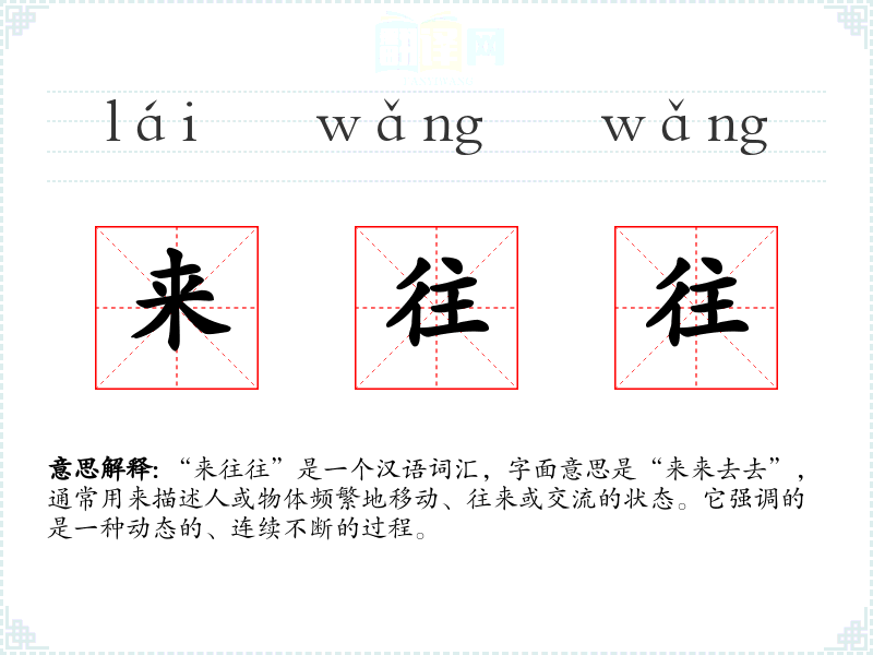 “来往往”由两个相同的动词“来”和“往”组成,这种重复结构在汉语中常见,用以强调动作的频繁性和连续性。这个词在古代文献中已有使用,随着时间的推移,其基本含义保持不变,但在现代汉语中的使用更加广泛和灵活。