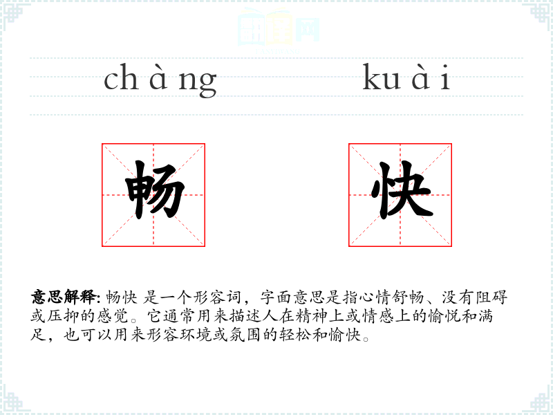 畅快 是一个形容词,字面意思是指心情舒畅、没有阻碍或压抑的感觉。它通常用来描述人在精神上或情感上的愉悦和满足,也可以用来形容环境或氛围的轻松和愉快。