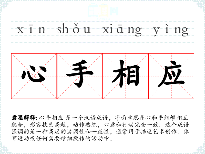 心手相应 是一个汉语成语,字面意思是心和手能够相互配合,形容技艺高超,动作熟练,心意和行动完全一致。这个成语强调的是一种高度的协调性和一致性,通常用于描述艺术创作、体育**或任何需要精细操作的活动中。