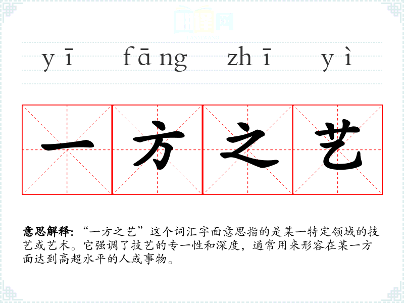 “一方之艺”这个词汇字面意思指的是某一特定领域的技艺或艺术。它强调了技艺的专一性和深度,通常用来形容在某一方面达到高超水平的人或事物。