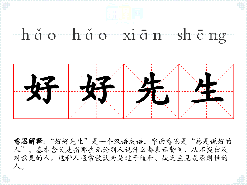 “好好先生”是一个汉语成语,字面意思是“总是说好的人”,基本含义是指那些无论别人说什么都表示赞同,从不提出反对意见的人。这种人通常被认为是过于随和、缺乏主见或原则性的人。