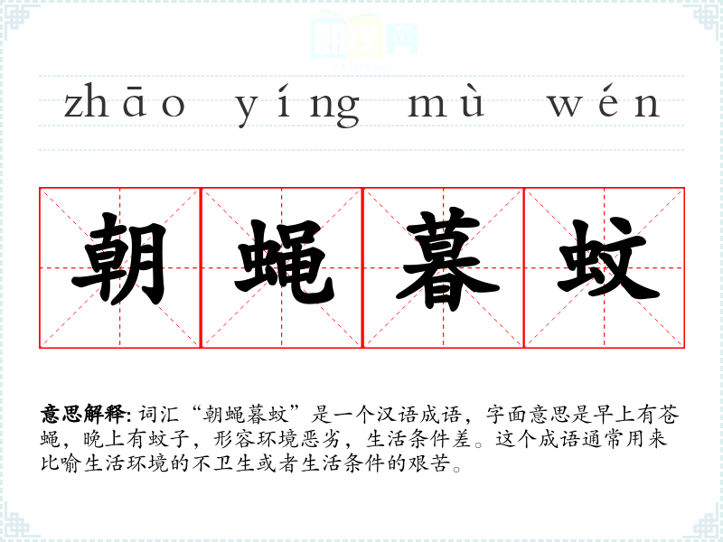 词汇“朝蝇暮蚊”是一个汉语成语,字面意思是早上有苍蝇,晚上有蚊子,形容环境恶劣,生活条件差。这个成语通常用来比喻生活环境的不卫生或者生活条件的艰苦。