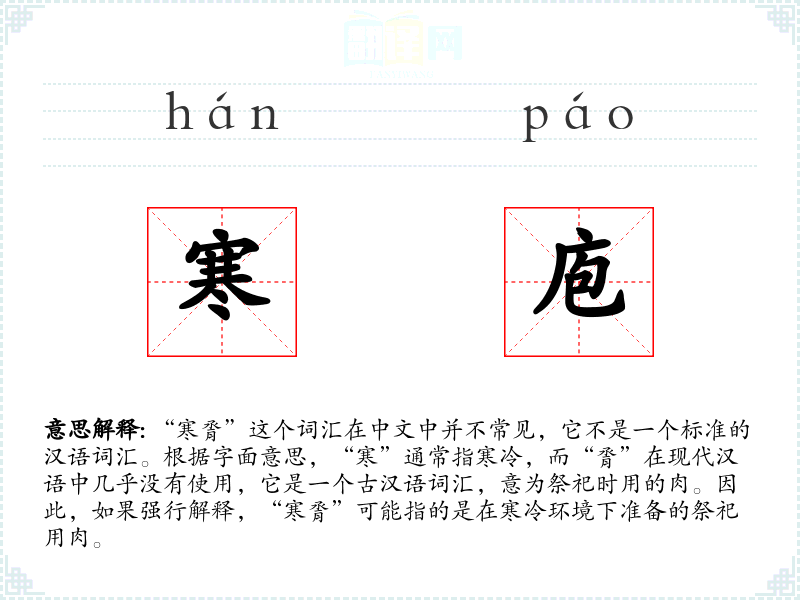 “寒脀”这个词汇在中文中并不常见,它不是一个标准的汉语词汇。根据字面意思,“寒”通常指寒冷,而“脀”在现代汉语中几乎没有使用,它是一个古汉语词汇,意为祭祀时用的肉。因此,如果强行解释,“寒脀”可能指的是在寒冷环境下准备的祭祀用肉。