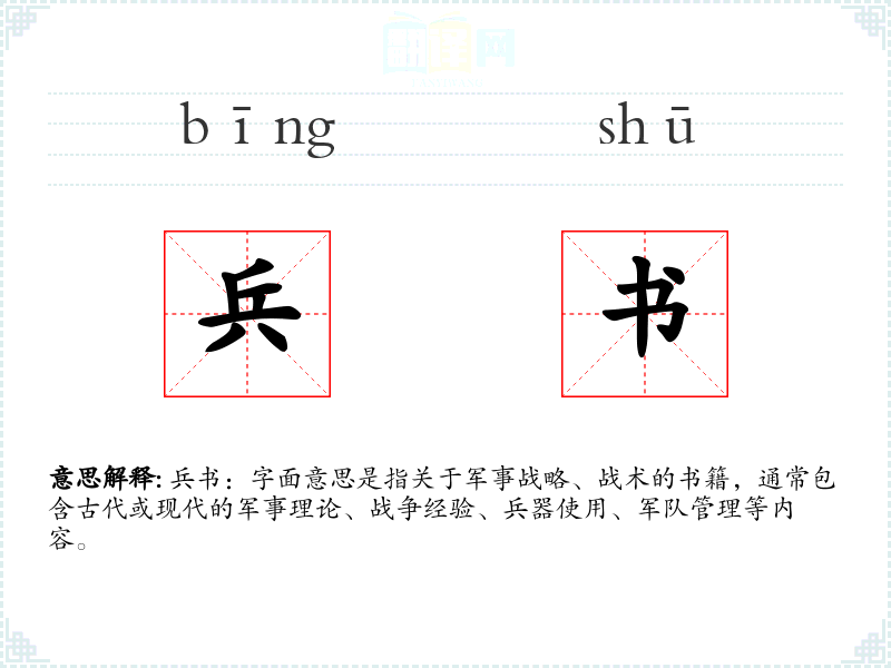兵书:字面意思是指关于军事战略、战术的书籍,通常包含古代或现代的军事理论、战争经验、兵器使用、军队管理等内容。