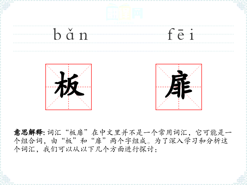词汇“板扉”在中文里并不是一个常用词汇,它可能是一个组合词,由“板”和“扉”两个字组成。为了深入学*和分析这个词汇,我们可以从以下几个方面进行探讨: