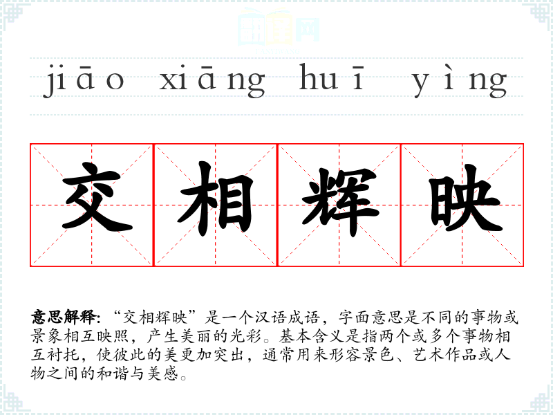 “交相辉映”是一个汉语成语,字面意思是不同的事物或景象相互映照,产生美丽的光彩。基本含义是指两个或多个事物相互衬托,使彼此的美更加突出,通常用来形容景色、艺术作品或人物之间的和谐与美感。