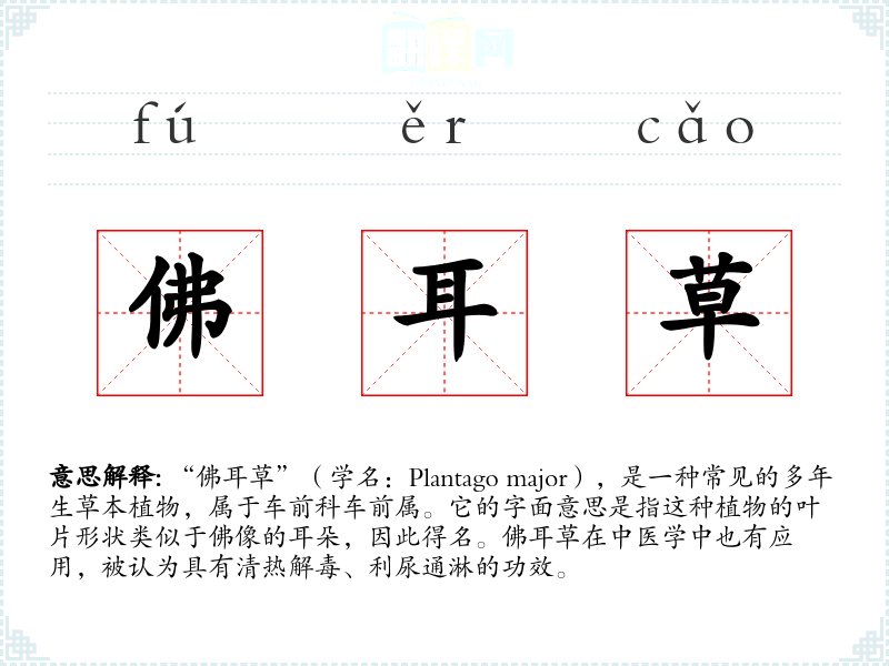 “佛耳草”(学名:Plantago major),是一种常见的多年生草本植物,属于车前科车前属。它的字面意思是指这种植物的叶片形状类似于佛像的耳朵,因此得名。佛耳草在中医学中也有应用,被认为具有清热解毒、利尿通淋的功效。