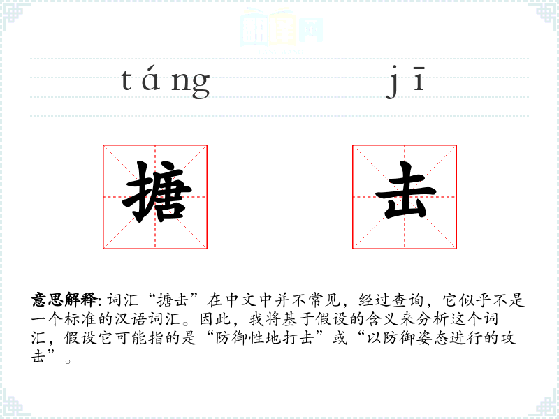 词汇“搪击”在中文中并不常见,经过查询,它似乎不是一个标准的汉语词汇。因此,我将基于假设的含义来分析这个词汇,假设它可能指的是“防御性地打击”或“以防御姿态进行的攻击”。