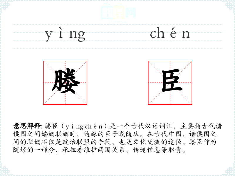 - 同义词:随从、侍臣、使者。这些词汇都指随行的人员,但“媵臣”特指随嫁的臣子。