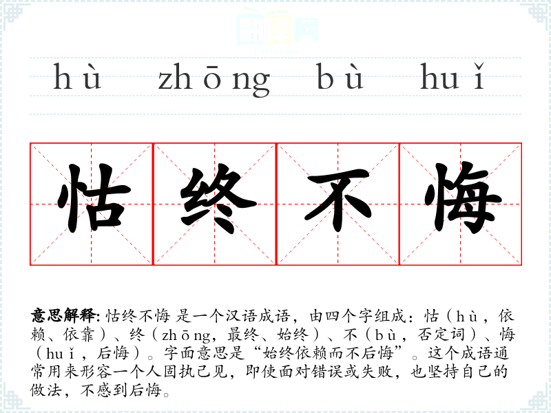 怙终不悔 是一个汉语成语,由四个字组成:怙(hù,依赖、依靠)、终(zhōng,最终、始终)、不(bù,否定词)、悔(huǐ,后悔)。字面意思是“始终依赖而不后悔”。这个成语通常用来形容一个人固执己见,即使面对错误或失败,也坚持自己的做法,不感到后悔。