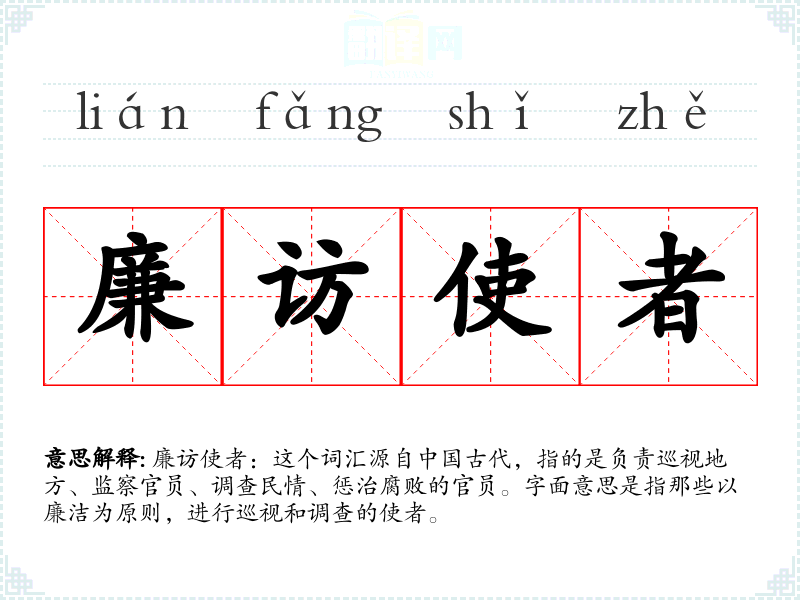 廉访使者:这个词汇源自**古代,指的是负责巡视地方、监察官员、调查民情、惩治腐败的官员。字面意思是指那些以廉洁为原则,进行巡视和调查的使者。