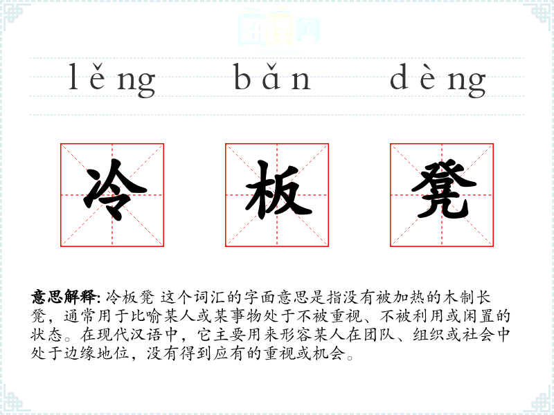 冷板凳 这个词汇的字面意思是指没有被加热的木制长凳,通常用于比喻某人或某事物处于不被重视、不被利用或闲置的状态。在现代汉语中,它主要用来形容某人在团队、组织或社会中处于边缘地位,没有得到应有的重视或机会。