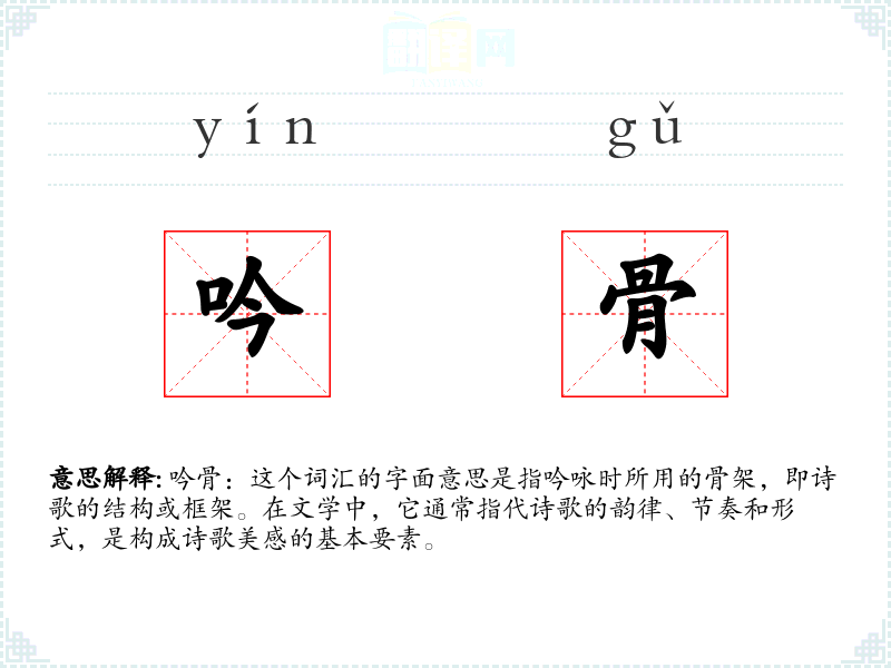 吟骨:这个词汇的字面意思是指吟咏时所用的骨架,即诗歌的结构或框架。在文学中,它通常指代诗歌的韵律、节奏和形式,是构成诗歌美感的基本要素。