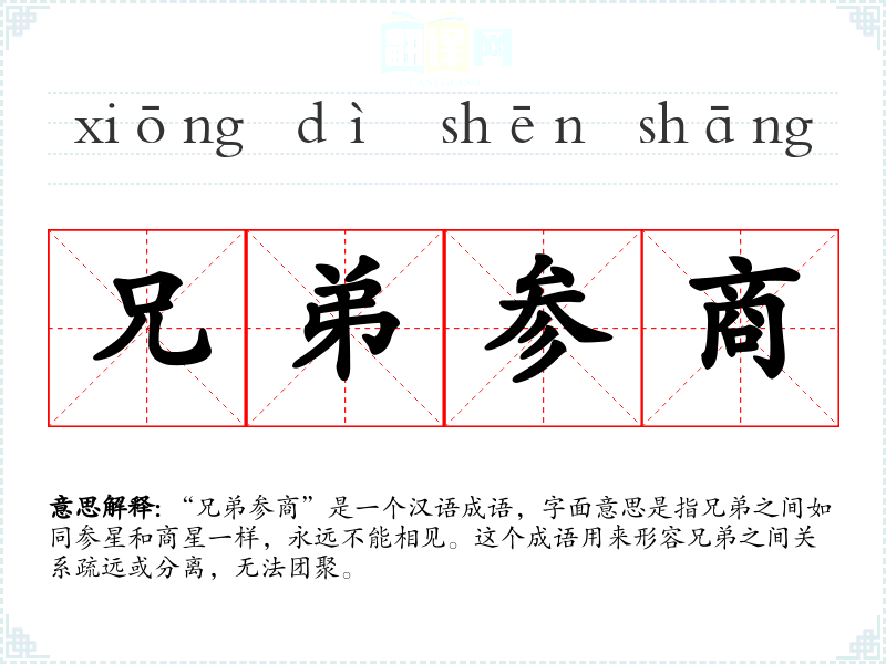 “兄弟参商”是一个汉语成语,字面意思是指兄弟之间如同参星和商星一样,永远不能相见。这个成语用来形容兄弟之间关系疏远或分离,无法团聚。
