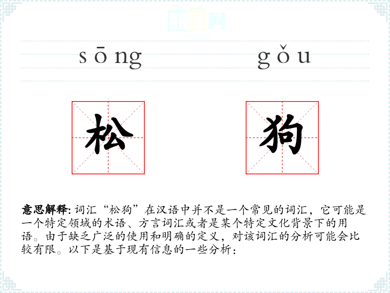 总的来说,由于“松狗”不是一个标准汉语词汇,对其的分析非常有限。如果有更多的上下文信息,可以更好地进行深入学习和分析。